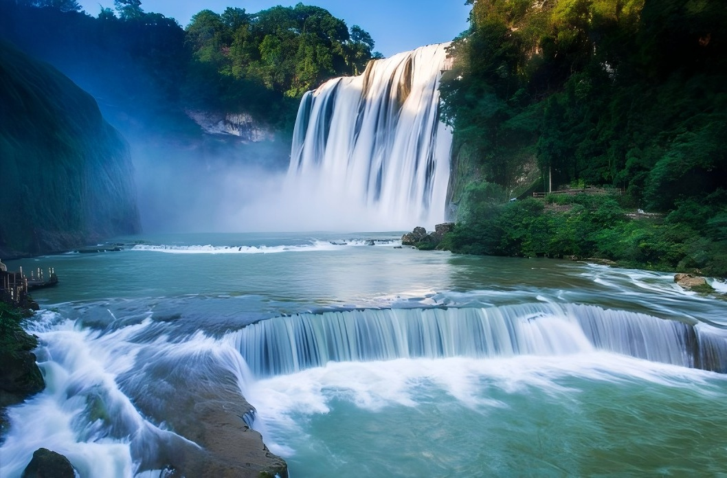 넷째 날은 하루 종일 황궈수 폭포(黄果树瀑布)를 관람합니다. 오전에는 대폭포 핵심 구역에 입장하여 아시아 최대 폭포의 웅장한 기세를 가까이서 느끼고 슈이리엔동(水帘洞) 동굴을 통과해 보세요. 오후에는 티엔싱차오(天星桥) 관광지 깊숙이 들어가 수이상스린(水上石林)을 하이킹하고, 수려한 인리엔쭈이탄(银链坠潭) 폭포를 찾아가 봅니다. 저녁에는 도우포탕(陡坡塘) 폭포로 이동하여 실경 야간 공연인 <다시 만나는 서유기(再回西游)>를 관람할 수 있습니다. 식사는 관광지 내 혹은 주변 식당에서 쏸탕위(酸汤鱼) 등 현지 특색 요리를 즐겨보세요. 숙소는 안순(安顺)입니다.