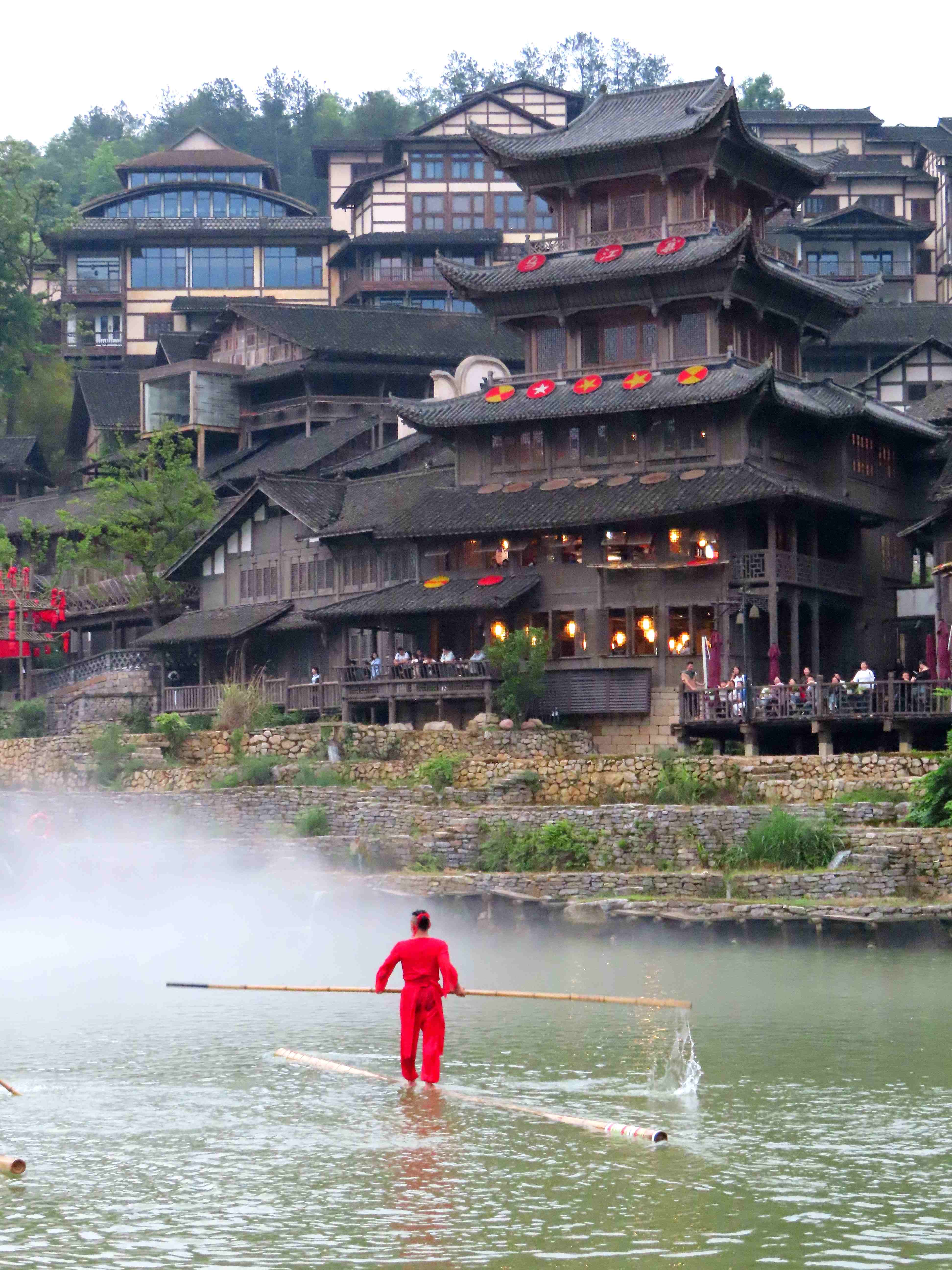 무형문화유산 "수상 경공(輕功)"으로, 공연자가 한쪽 발로 대나무 위에 한 발로 서서 강 위에서 여유롭게 춤을 추며, 산수화와 함께 시의 정취를 선사합니다.