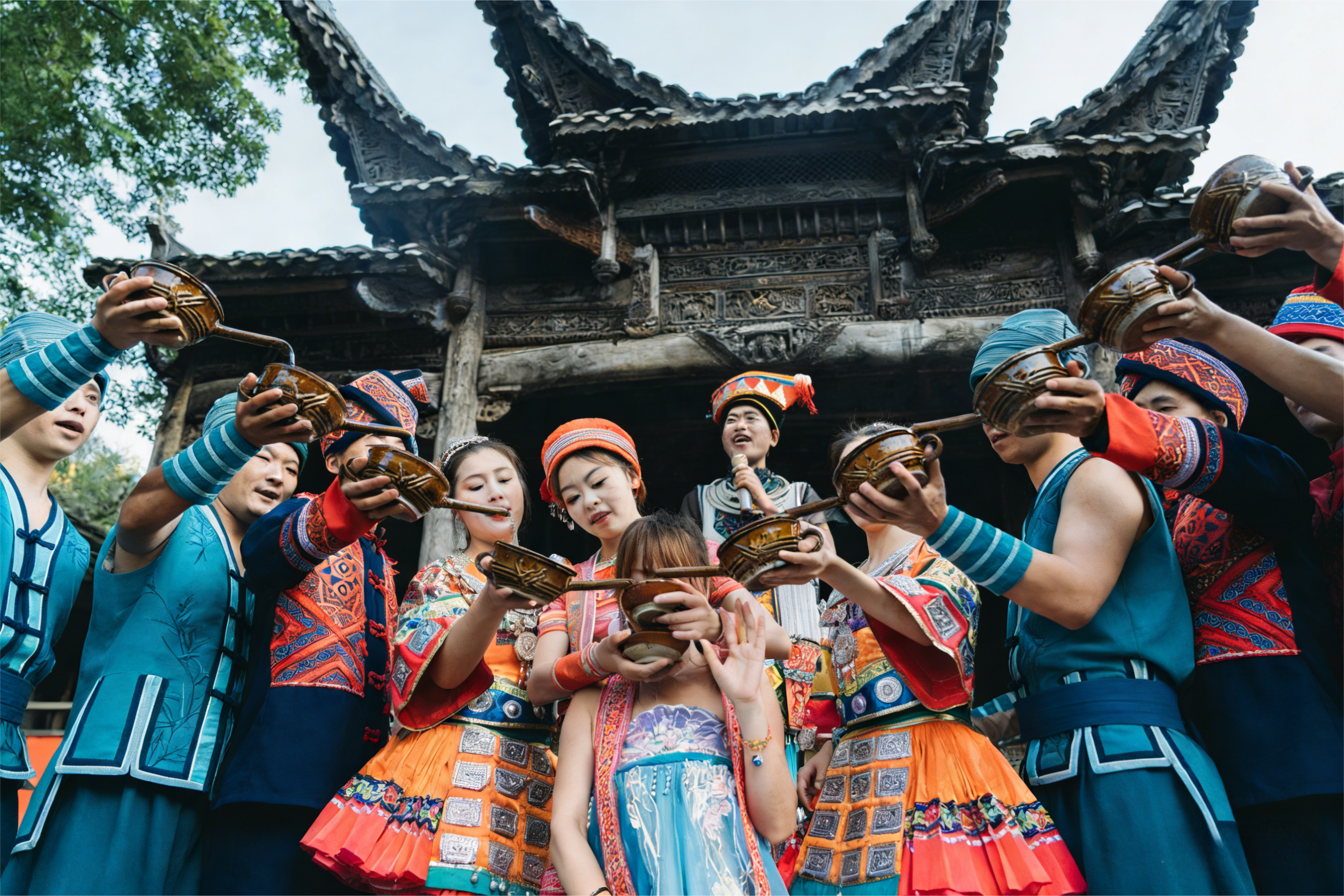 "팔방연(八方宴)"에 참여하면, 화려한 전통 의상을 입은 먀오족 소녀들이 "고산유수(高山流水)"라는 특별한 의식으로 술을 권합니다. 식후에는 경쾌한 죽간무(竹竿舞, 움직이는 대나무 사이로 발을 디디며 추는 춤)를 함께하며 현지의 리듬에 녹아들어 보세요.