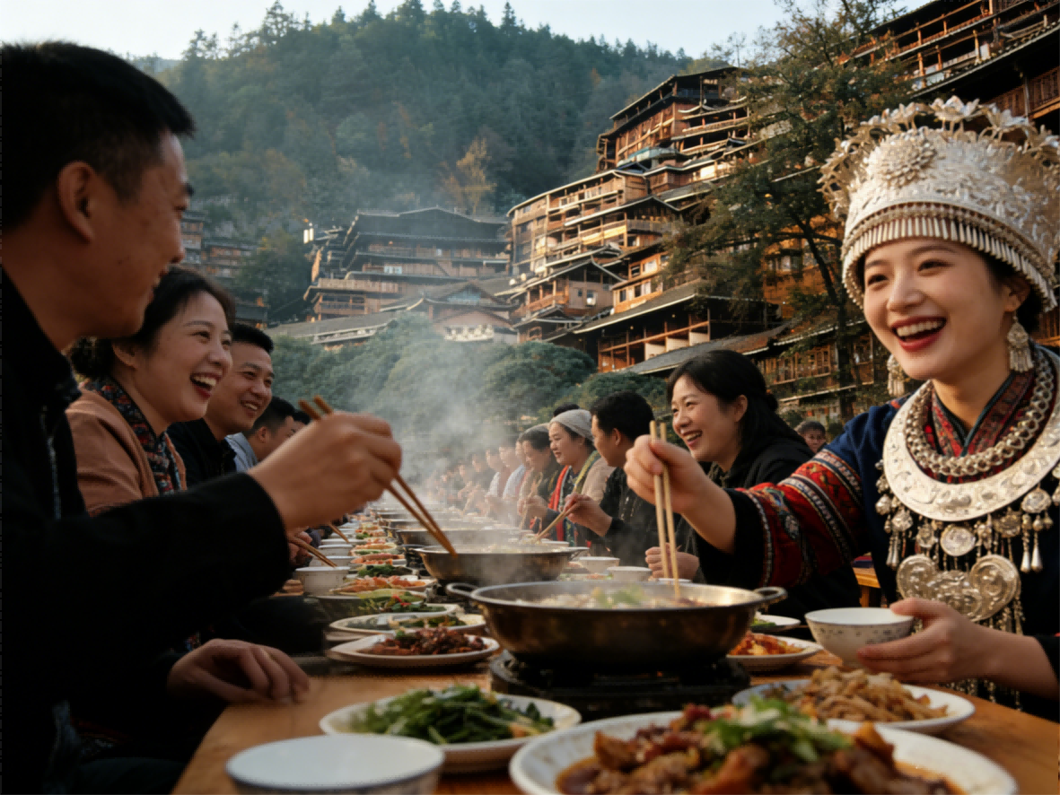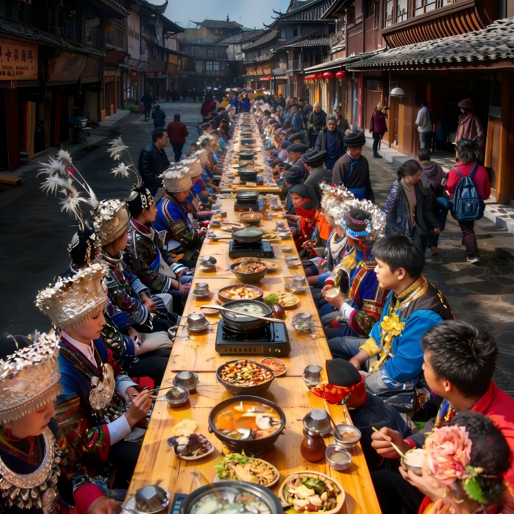 장탁연(長桌宴)천년이 넘는 역사를 지닌 먀오족의 연회로 "천년 동안 끝나지 않는 연회"라고도 불리며, 먀오족이 손님을 맞이하는 최고의 예우를 보여줍니다.