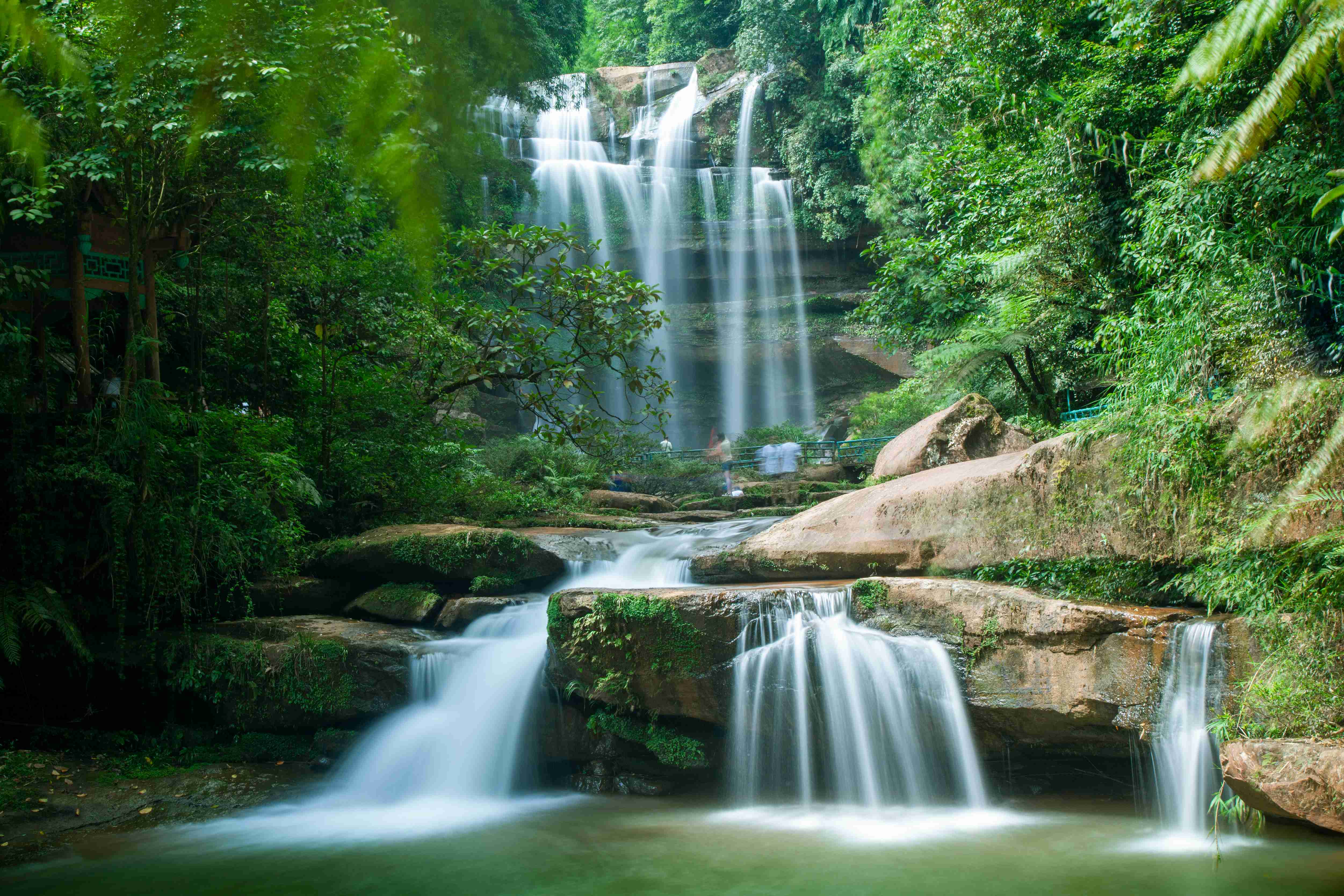 사동구(四洞溝)의 핵심은 4단 폭포입니다. 첫 번째 폭포 '수림동(水簾洞)'은 높이 31미터로, 관광객은 돌길을 따라 폭포 뒤로 들어가 물막이 장막이 얼굴을 스치는 시원함을 느낄 수 있습니다. 이어지는 '월양담(月亮潭)'은 42미터 너비의 호형 폭포면이 은빛 빗살처럼 휘어진 초승달 모양을 닮았습니다. “날개 달린 개구리 절벽” 폭포는 너비 43미터로, 거대한 개구리가 웅크리고 목욕하는 모습을 닮았다. 마지막은 낙차 60미터에 달하는 “백룡담”으로, 폭포 소리가 천둥 같고 기세가 웅장하다. 폭포 외에도 이곳은 생태 보물창고다. 이 관광지는 '만죽의 정원'이라는 명성을 지니고 있으며, 8속 40여 종의 푸른 대나무가 자라고 있다. 더욱 놀라운 것은 공룡과 같은 시대의 '식물 화석'인 고사리나무가 단사암으로 포장된 길가 곳곳에서 발견된다는 점이다. 이 희귀 식물들은 붉은 단사암층과 신비로운 천연 석교와 함께 원시 생태의 그림을 완성한다.