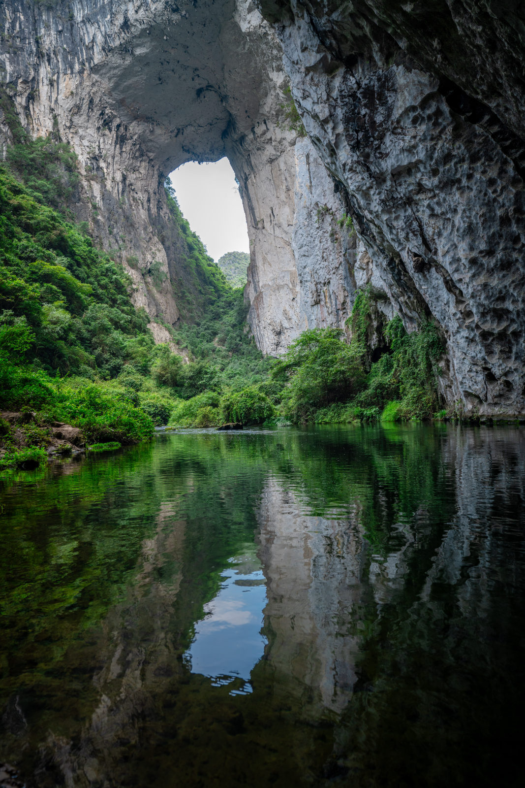 대성지안(大圣之眼)을 촬영할 때, 낮은 각도로 수면에 가깝게 촬영해 보세요, 물에 비친 반사를 활용하여 대칭 구도를 만들 수 있습니다.